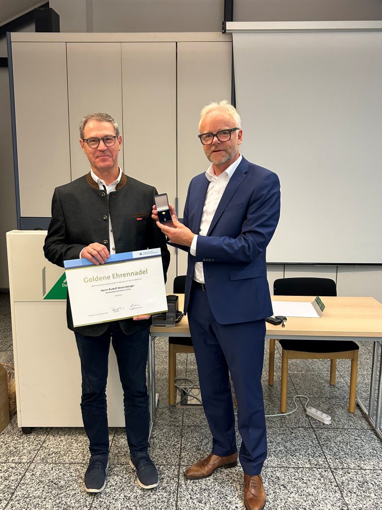 Für seinen 17 -jährigen Einsatz als Kreishandwerksmeister bekam Herr Waxenberger von Herrn Hüpers ( HWK-Geschäftsführer ) die Goldene Ehrennadel überreicht.