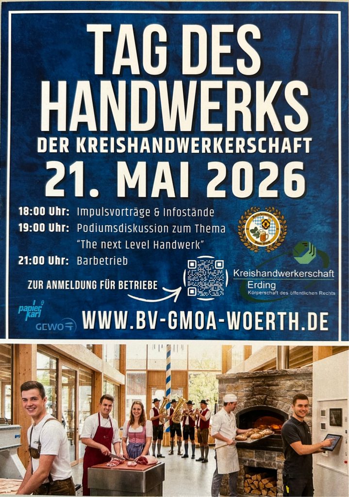 Am 21.05.2026 findet der Tag des Handwerks statt. Tischreservierungen sind ab sofort möglich. Entweder den QR-Code scannen oder eine Email an:                  anmeldung@bv-gmoa-woerth.de